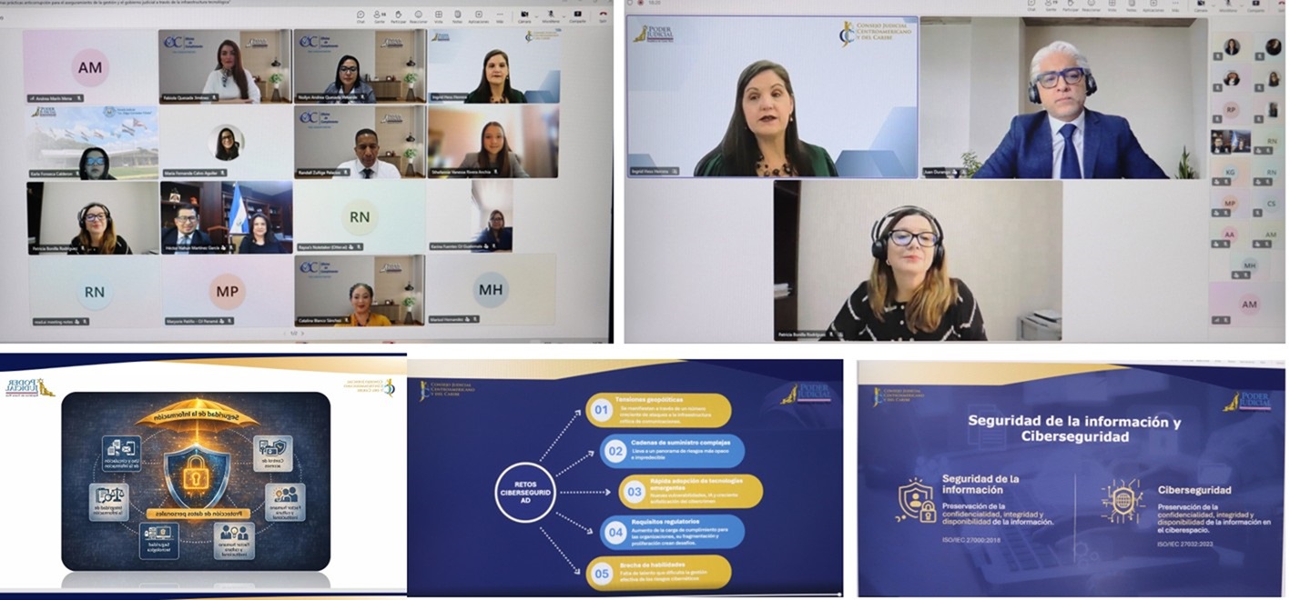 La efectiva gestión de lineamientos y buenas prácticas en ciberseguridad y seguridad de la información, aportan a los Poderes Judiciales herramientas en su blindaje contra la corrupción y la generación de confianza ciudadana, temas abordados por países de la región Centroamericana y El Caribe, en un conversatorio virtual, este jueves 29 de enero de 2026.